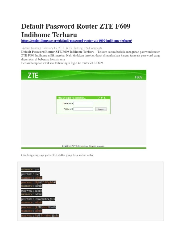 Silahkan ubah password wifi kamu. Temukan jawabannya dalam artikel username dan password baru modem indihome zte f609. Dalam post kali ini, admin menyediakan username dan password terbaru untuk modem zte f609 indihome. Karena alasan untuk mengamankan modem indihome, terkadang ketika kita mengganti default password admin modem zte f609 atau password admin berubah sendiri. Biasanya, indihome sendiri melalui perubahan password satu.
